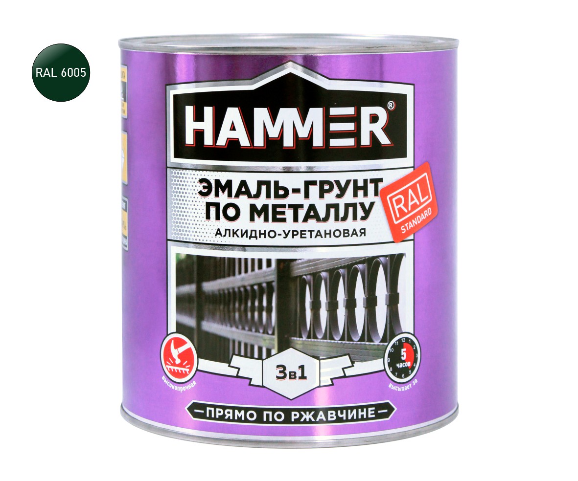 Эмаль-грунт по металлу HAMMER «3 в 1» алкидно-уретановая прямо по ржавчине. Для наружных и внутренних работ. Совмещает свойства преобразователя ржавчины, антикоррозийного грунта и эмали, колерована по RAL.